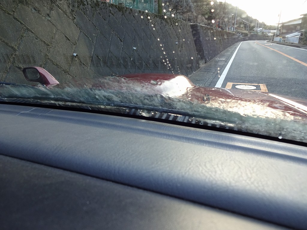 ここ数日は関東でも記録的な寒さになっています。神奈川県でも最低気温がマイナス4度くらいまで下がっているので、昼間でも場所によっては気温がマイナスに突入しています。このレベルの寒さになると車を始動してしばらく走行し、エアコンから暖かい風が出てくるようになっても油断は出来ません。上記画像は走り出してから30分程走行した状態の車のフロントウインドウですが、フロントデフロスターを全開にしていても氷が溶けません。車内の暖かい風よりも、走行風による冷却の方が強いせいかワイパーは凍ったままでした。「車内が暖かくなれば、凍っていた場所も溶けるだろう。」と思う方が多いですが、気温と状況によっては社外は凍ったままの場合がありますので注意が必要です。当然ですが何十分も走って車内が暑くなるくらいに暖まったとしても、上記画像のようにワイパーが凍ったままの状態でワイパーを作動させたらモーター等にダメージを与える事になります。ぜひ車の状態をきちんと確認してから、各機能を作動させるようにして下さい。ちなみに同じ理由で道路状況にも注意が必要です。「昼間なら大丈夫だろう。」と思いがちですが、今の時期は昼間でも日陰だと凍ったままの場所もあります。アイスバーン状態になってしまっている路面はスパイクタイヤレベルでないとほぼ確実に滑りますので、昼間でも油断せずに路面の状況をご確認下さい。ちなみにそろそろ毎年恒例の雪の時期に突入しますが、雪が少しでも降るエリアの方は早めのスタッドレスタイヤへの履き替えをオススメします。雪が降ってからガソリンスタンドやカー用品店等で履き替えを依頼すると、とんでもない金額を請求されたりする場合が多いので、雪が降る前に準備しておいた方が最終的には安価で安全です。当店でも履き替えは可能ですので、希望される方はお気軽にご相談下さい。