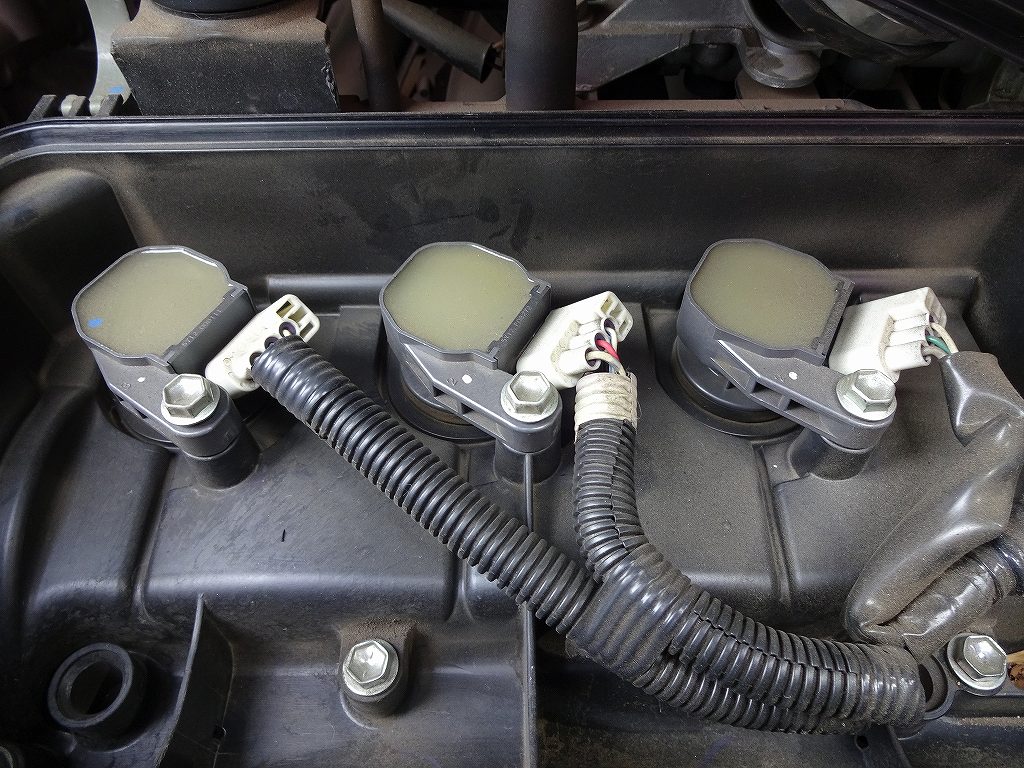 最近、点火系のトラブルで入庫する車がかなり重なっております。どの車も大体イグニッションコイルやプラグ、プラグコードと呼ばれるパーツがダメになっているのですが点火系の修理は車種によって地味に違うのでご注意下さい。まず上記画像のイグニッションコイル(画像中央の3つ並んでいるパーツ。)は非常に高価なパーツです。車種にもよりますが純正だと1本1万円前後で、社外品でも6000円前後します。このパーツは気筒数と同じ数だけ必要ですので、軽自動車だったら3本(車種によっては4本。)×1万円でパーツ代だけでも3万円になります。これがイグニッションコイルではない、普通のプラグコードだとパーツ代は7000円前後です。プラグコードも気筒数と同じ数が必要ですが、3本全部で7000円程度です。たまに「前乗っていた車は点火系がダメになった時は1万円でお釣り来たのに、何で今回は同じ軽自動車で3万円とかになるんだ!」と憤慨される方がいますが、理由は上記パーツの価格差です。また、プラグもイリジウムかどうかで大分価格差があります。普通のプラグだったら1本500円とかで済むのですが、純正でイリジウムを使っている車だと1本2000円に跳ね上がります。3気筒の車だったら4500円も差が出てしまいますのでご注意下さい。イリジウムプラグを使っていてイグニッションコイルを採用している車を、全部交換するとしたら大体36000円、普通のプラグとプラグコードの車は全部交換しても8500円です。これに工賃が加算されるのですが、イグニッションコイルを採用している車は大体色々外さないとイグニッションコイルとプラグにご対面出来ないので工賃も高くなります。最終的には3~4万円の差が出たりするので、自身の車がどのような点火システムを採用しているかを知っておいた方が故障した時の修理代の目安が解りやすいと思います。