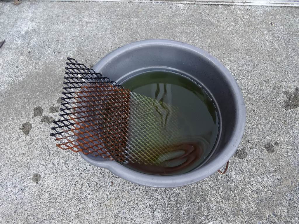 たまにお客様から「良いサビ落としって何ですか?」と聞かれる事があります。確かに現在は様々なメーカーから、多数のサビ落としが出ているので迷う気持ちは良く解ります。しかし残念な事に私が使っているのはどこのメーカーのサビ落としでもなく、ただのクエン酸なのです。基本的に漬け置き出来るサイズのパーツは上記画像のように、バケツの中にクエン酸を溶かした水を入れて1日くらい放置します。クエン酸の量は結構適当で、このくらいのバケツであれば底が隠れるくらいまでクエン酸を入れてから、バケツの80%くらいまで水を入れる感じでしょうか?